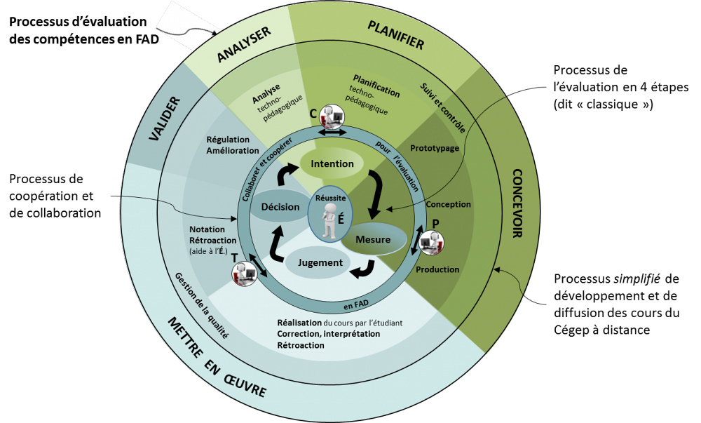 L’outil réseau regroupe des ressources imprimées, des vidéos et de nombreuses références visant à soutenir le développement et la diffusion d’activités d’évaluation formative et sommative dans le cadre d’un cours offert, en tout ou en partie, à distance. Le processus d’évaluation en formation à distance y est présenté en cinq étapes distinctes, soit :