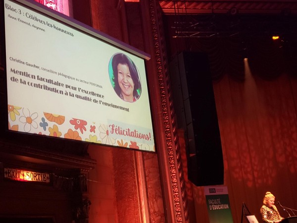C’est avec émotion et fierté que l’équipe Performa a assisté à la remise de la mention facultaire pour l’excellence de la contribution à la qualité de l’enseignement à Christine Gaucher lors du rassemblement des fêtes de la Faculté d’éducation le 15 décembre dernier.