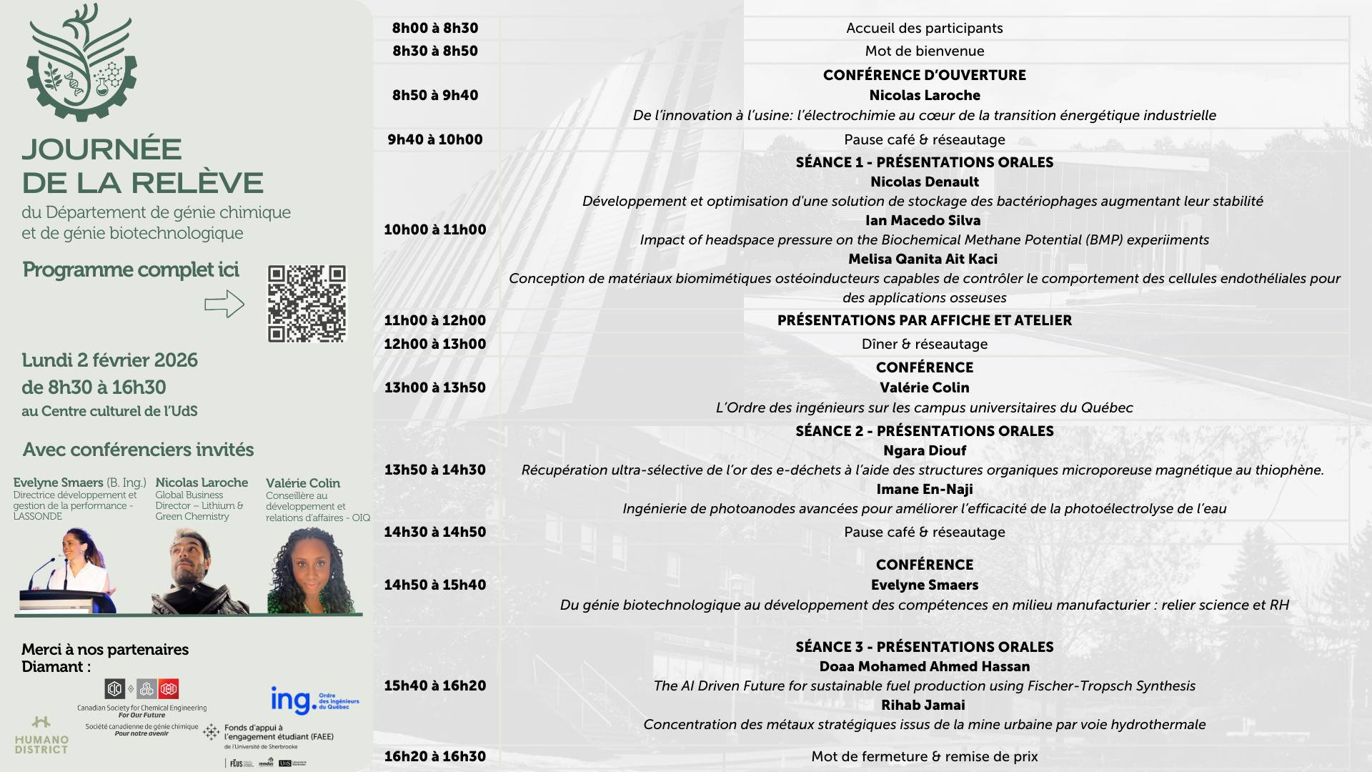 La Journée de la relève organisée par le Département de génie chimique et de génie biotechnologique de l’Université de Sherbrooke a pour but de faire connaître et valoriser les travaux de recherche au sein du département. La nouvelle formule du symposium rassemble l’ensemble des différents membres du département : corps professoral, équipe technique et professionnelle, personnes étudiantes du 1er cycle, des cycles supérieurs, et stagiaires postdoctoraux. En plus, la participation d’entreprises constitue une occasion unique d’exposer vos domaines d’expertise auprès d’une clientèle d’intérêt tout aussi spécialisée et compétente. Ceci vise à favoriser le développement d’un réseau de contacts entre les membres d’entreprises et les étudiants universitaires présents.