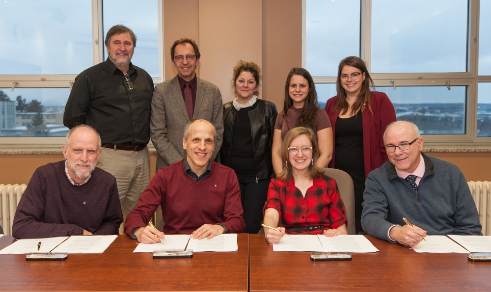 1re rangée (en avant) : Pr Jean Goulet, vice-recteur aux ressources humaines, Pr Pierre Cossette, recteur, Mme Maude Benoit-Charbonneau, responsable aux relations de travail du SAREUS, et M. Alain Lachapelle, conseiller syndical à l’Alliance de la fonction publique du Canada.