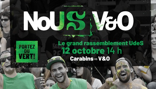 La communauté de l’UdeS est mobilisée pour encourager ses porte-couleurs dans le cadre du grand rassemblement NoUS V&O qui aura lieu le samedi 12 octobre, à 14 h (fin de semaine de l'Action de grâces), au stade extérieur du Campus principal. Notre équipe de football affrontera les Carabins de l'Université de Montréal. Ce match NoUS V&O est l'occasion de vivre du football à son meilleur dans une ambiance festive, en famille et entre collègues et amis!