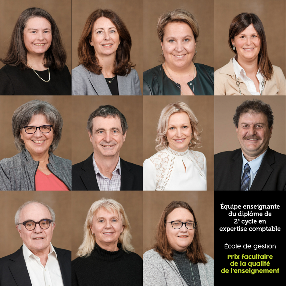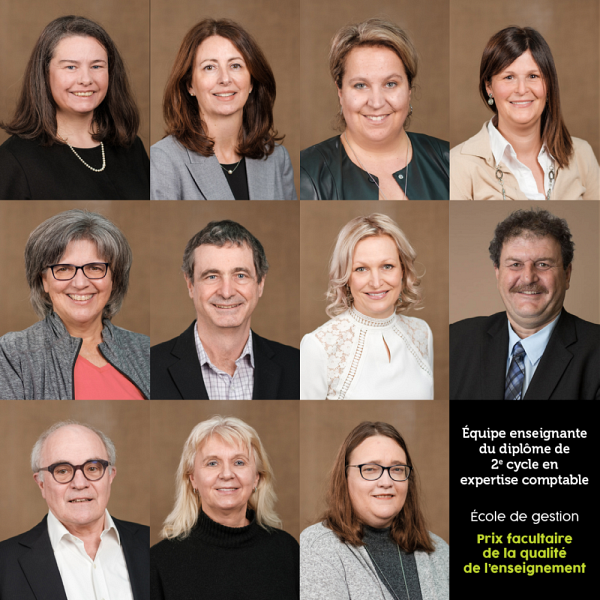 Chaque année depuis 10 ans, l’équipe enseignante du diplôme de 2e cycle en expertise comptable de l’École de gestion met à profit esprit de collaboration et engagement pour assurer la réussite de quelque 120 personnes étudiantes aspirant au titre de comptables professionnels agréés. Son accompagnement est si humain et personnalisé que le taux de réussite est parmi les plus élevés malgré la grande ouverture du programme à l’admission. Cette formidable équipe, ce sont les professeures Caroline Talbot, Danièle Blanchette, Caroline Blais, Marie-Andrée Babineau et Aurélie Desfleurs, et les personnes chargées de cours Nathalie Lessard, Mélanie Martel, Mario Côté, Gaétan Picard, Annie Pomerleau et Rémi Naaman.