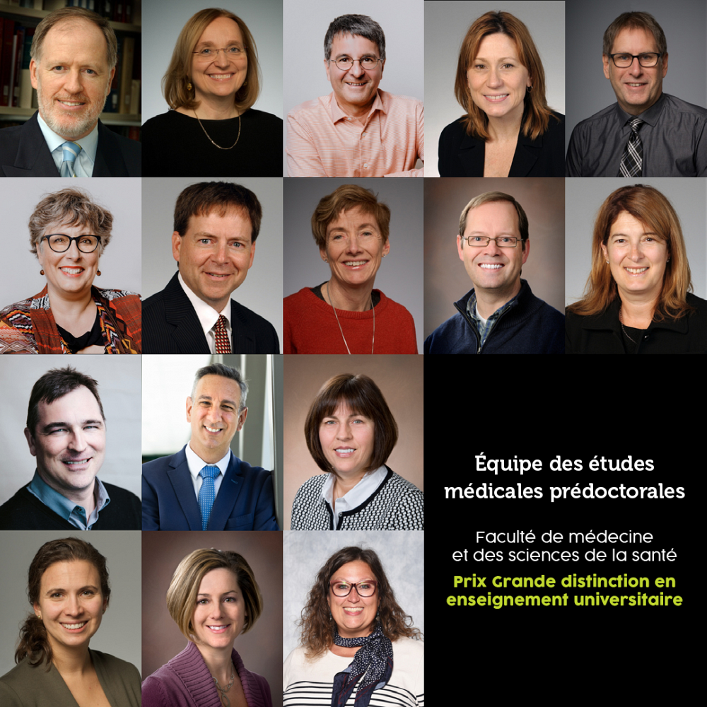 Cette distinction honore cette année l’équipe des études médicales prédoctorales (vidéo), qui a su créer une mobilisation sans précédent pour imaginer, concevoir, mettre en œuvre, puis déployer un projet exceptionnel : la refonte majeure de ce programme d’études. Le nouveau cursus est désormais fondé sur l’agir avec compétence en situation professionnelle, en mettant de l’avant le décloisonnement disciplinaire, le généralisme et l’approche globale de la personne ainsi que la collaboration professionnelle et la flexibilité. Ce projet pharaonique, que le doyen Dominique Dorion n’hésite pas à qualifier de chef-d’œuvre pédagogique, est un immense succès grâce à l’engagement et à la vision de cette équipe, composée de professeurs, professionnels, conseillères pédagogiques, membres du personnel administratif et de la direction du programme.