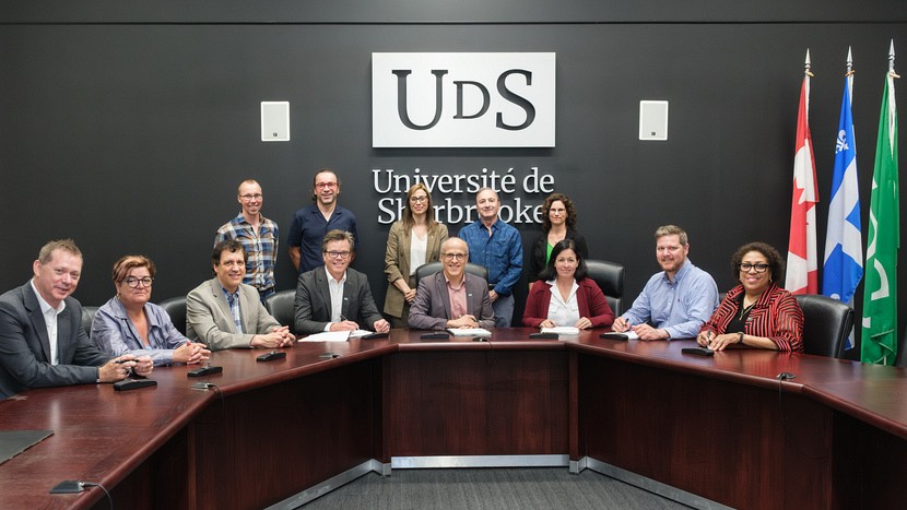 Les huit signataires de la nouvelle convention (à l’avant) accompagnés de personnes collaboratrices (debout) : M. Denis Simard, directeur de la section Relations de travail et rémunération au SRH, Pre Carole Beaulieu, doyenne Sciences; Pr Louis Marquis, doyen Faculté de droit; Pr Patrik Doucet, vice-recteur aux ressources humaines; Pr Pierre Cossette, recteur; Pre Julie Myre Bisaillon, présidente du SPPUS; Pr Finn Makela, 1er vice-président du SPPUS; Pre Gessie Brisard, secrétaire générale du SPPUS. À l'arrière : Pr Felix Berrigan secrétaire du SPPUS; Pr Jean-Pierre Le Glaunec, 2e vice-président du SPPUS; Sasha Cardinal, directrice générale du Service des ressources humaines ; Pr Mario Fortin, trésorier du SPPUS; Pre Manon-Ghislaine Guillemette, membre du comité de négociation.