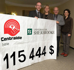 L'équipe de la campagne de financement de Centraide Estrie vous demandait de fournir votre 110 % afin d'élever la contribution des membres du personnel à 110 000 $ pour la campagne Centraide 2007 par rapport aux dons de 100 000 $ de l'an dernier. Grâce à une participation exceptionnelle, le résultat a dépassé les attentes puisque le montant de 115 444 $ a été atteint à ce jour. Centraide distribuera ces sommes à des organismes communautaires de Sherbrooke et de la région afin de permettre à des personnes plus démunies de bénéficier de services dont elles ont vraiment besoin. Sur la photo, Frédéric Brochu, directeur du Service des archives et président de la campagne Centraide 2006, France Myette, registraire et présidente de la campagne universitaire Centraide 2007, Jean Desclos, vice-recteur à la communauté universitaire, et Sylvie Masse, directrice de la campagne Centraide Estrie.