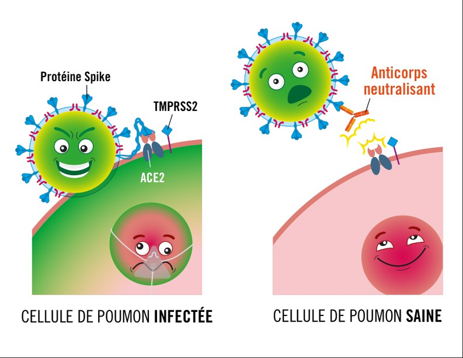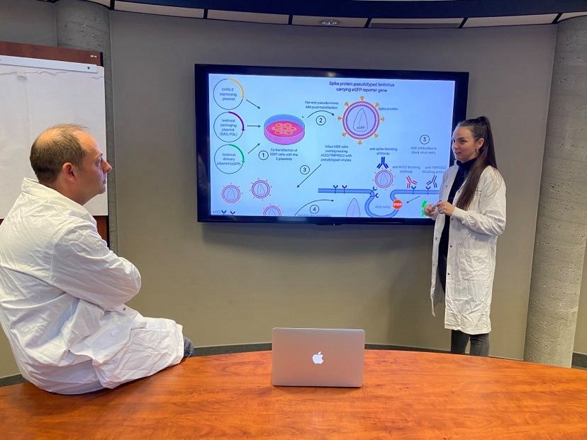 Comme il est impossible à ce stade-ci de travailler avec le « vrai » virus de la COVID-19 à moins d’avoir un niveau de confinement 3 en laboratoire, le modèle in vitro utilise un intrus que l’on appelle couramment un « pseudo-virus », celui-ci imitant le processus d’infection du SARS-CoV-2 tout en ne possédant pas le côté hautement infectieux du virus natif. Ces « pseudo-virus » COVID-19 sont composés de trois éléments : à leur surface, la protéine « Spike » du nouveau coronavirus, un environnement viral interne provenant du modèle du virus HIV (Sida) et finalement, une protéine fluorescente verte (GFP) permettant de suivre l’entrée du virus dans la cellule humaine. Une fois créés, ils peuvent entrer en interaction avec des cellules cibles qu’ils « pseudo-infectent ». La protéine fluorescente, sous une certaine lumière, permet alors d’identifier les cellules infectées et de mieux suivre l’évolution de l’infection.