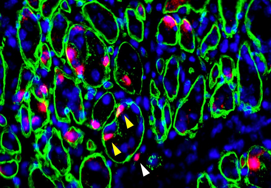 Les cellules souches saines transplantées dans les muscles dystrophiques, marquées en rouge dans la figure, se multiplient efficacement et se fusionnent aux fibres musculaires porteuses du gène responsable de la maladie. Lorsqu’elles fusionnent avec les tissus musculaires, les cellules saines ajoutent leur noyau à la fibre musculaire défaillante pour favoriser la guérison. Elles se complètent. La cohabitation des deux cellules et leur fusion au tissu musculaire permettent au tissu d’amorcer sa régénération.