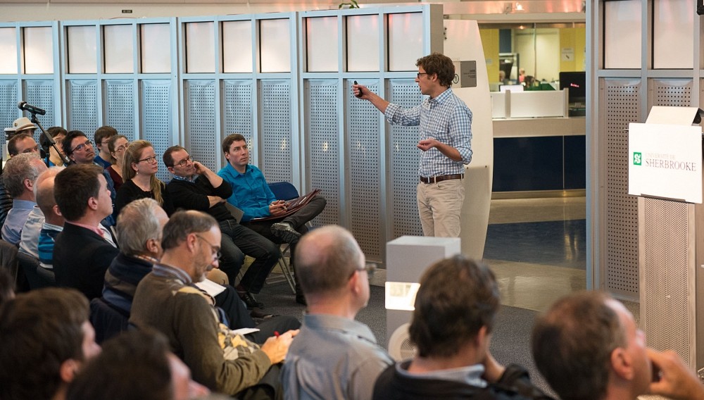 Afin de mettre en œuvre la vision solide et ambitieuse que les partenaires du projet, soient le Département de physique et leurs collaborateurs en génie, ont élaborée, une rencontre unique s'est déroulée le 9 octobre dernier à l'Université de Sherbrooke. Plus de 100 personnes de tout horizon y étaient rassemblées : professeur-e-s, scientifiques, étudiants-es, administrateurs-trices, ou encore membres du paysage industriel de l'Estrie. Il était tout d'abord question de présenter dans sa globalité le programme Apogée ainsi que le projet des chercheurs de l'Université de Sherbrooke qu'il subventionne désormais. Ensuite, il s'agissait de saisir l'opportunité parfaite de recueillir par le biais de tables rondes les suggestions de l'audience quant à certaines orientations à donner à ce projet de recherche d’envergure intitulé "De la science quantique aux technologies quantiques".