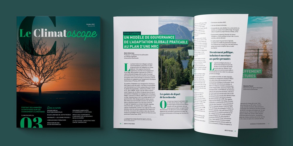 Comment encadrer l’obsolescence prématurée des objets? Quelles sont les nouvelles pratiques en urbanisme pour s’adapter aux changements climatiques, comme la lutte aux ilots de chaleurs urbains? Comment l’agriculture peut-elle réduire ses émissions de GES et maintenir une diversité alimentaire? Ce numéro met la table sur les grands défis qui nous habitent à l’aube de la 26e Conférence des Nations Unies sur les changements climatiques. On doit non seulement réfléchir aux défis actuels et à venir, mais aussi montrer que des solutions existent et que l’on doit agir. C’est l’objectif de ce nouveau numéro, et nous espérons qu’il donnera espoir en ce sens