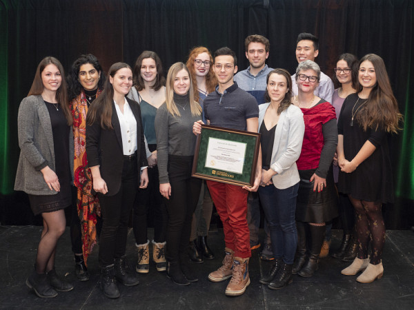 Le groupe Broadway UdeS, représenté par Charles Berthorld, physiothérapie, a quant à lui reçu le Prix Envergure des mains de Pre Jocelyne Faucher, Secrétaire générale et vice-rectrice à la vie étudiante et de Mario Trépanier, directeur du Centre culturel de l'UdeS