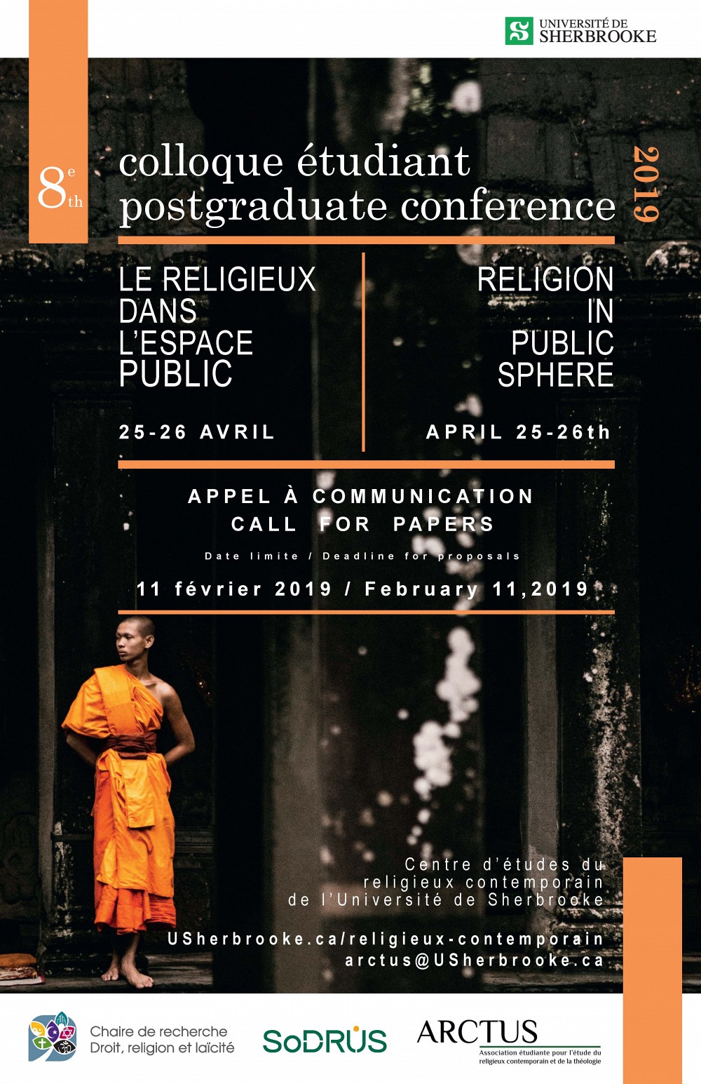 Le 8e Colloque international pour étudiants et jeunes chercheurs sur le religieux contemporain se tiendra à l'université de Sherbrooke les 25 et 26 avril 2019, sur le thème du religieux dans l'espace public.