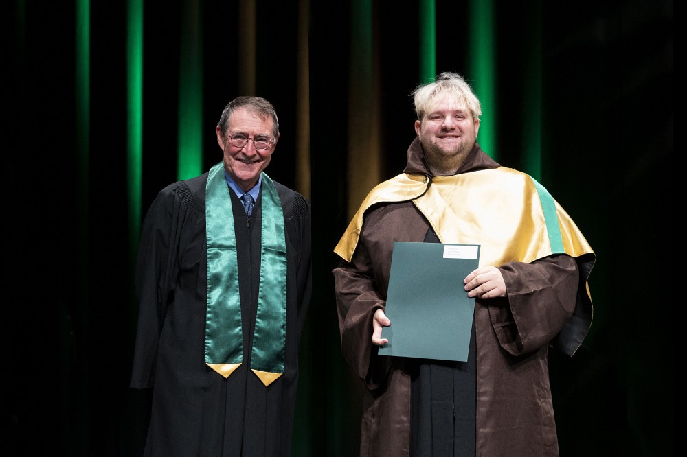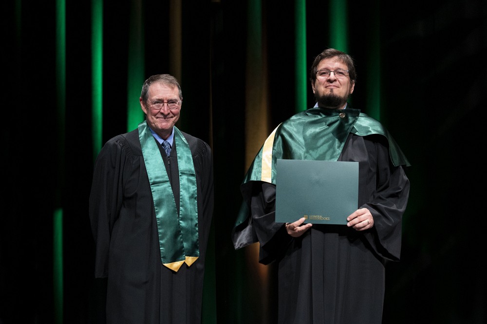 Quatre nouveaux diplômés et diplômées ont ensuite fièrement défilé sur la scène pour immortaliser le moment en compagnie du professeur Marc Dumas, directeur du CERC.