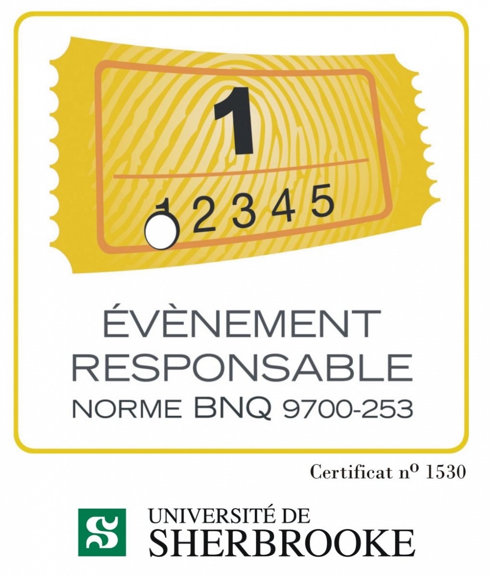 Cette mention, accordée par l'Université de Sherbrooke, signifie que nous respectons les critères de la norme 9700-273 du Bureau de normalisation du Québec (BNQ) en gestion écoresponsable d'évènements. Pour atteindre les exigences du niveau 1 de cette norme (le plus bas niveau sur 5) nous avons dû poser de nombreux gestes concernant six volets d'actions: choix des fournisseurs, choix reliés à l’alimentation, matériel et sources d'énergie, transport durable et gaz à effet de serre (GES), matières résiduelles et sensibilisation. Ainsi, nous avons privilégié les fournisseurs locaux, nous offrons des produits biologiques, nous avons un objectif de récupération de 80 % des matières résiduelles, etc.