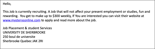 Depuis le 3 juin 2019, des tentatives d’hameçonnage concernant une offre d'emploi à temps partiel et ciblant des adresses @USherbrooke.ca ont été rapportées par notre équipe de sécurité informatique. L'expéditeur du courriel, dont l'objet est « Urgent opportunity part-time », semble être une personne ayant une adresse @USherbrooke.ca.