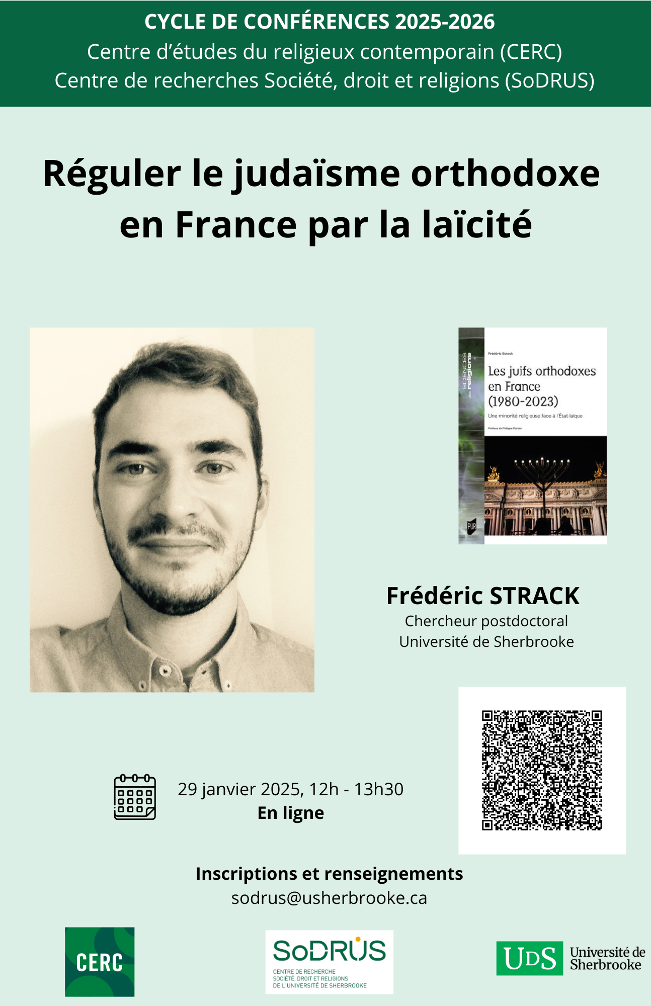 Frédéric Strack, chercheur postdoctoral à l'Université de Sherbrooke, a récemment publié un ouvrage tiré de sa thèse de doctorat, Les juifs orthodoxes en France (1980-2023) (PUR, 2025). Dans le cadre de cette conférence, il en présente certains résultats.
