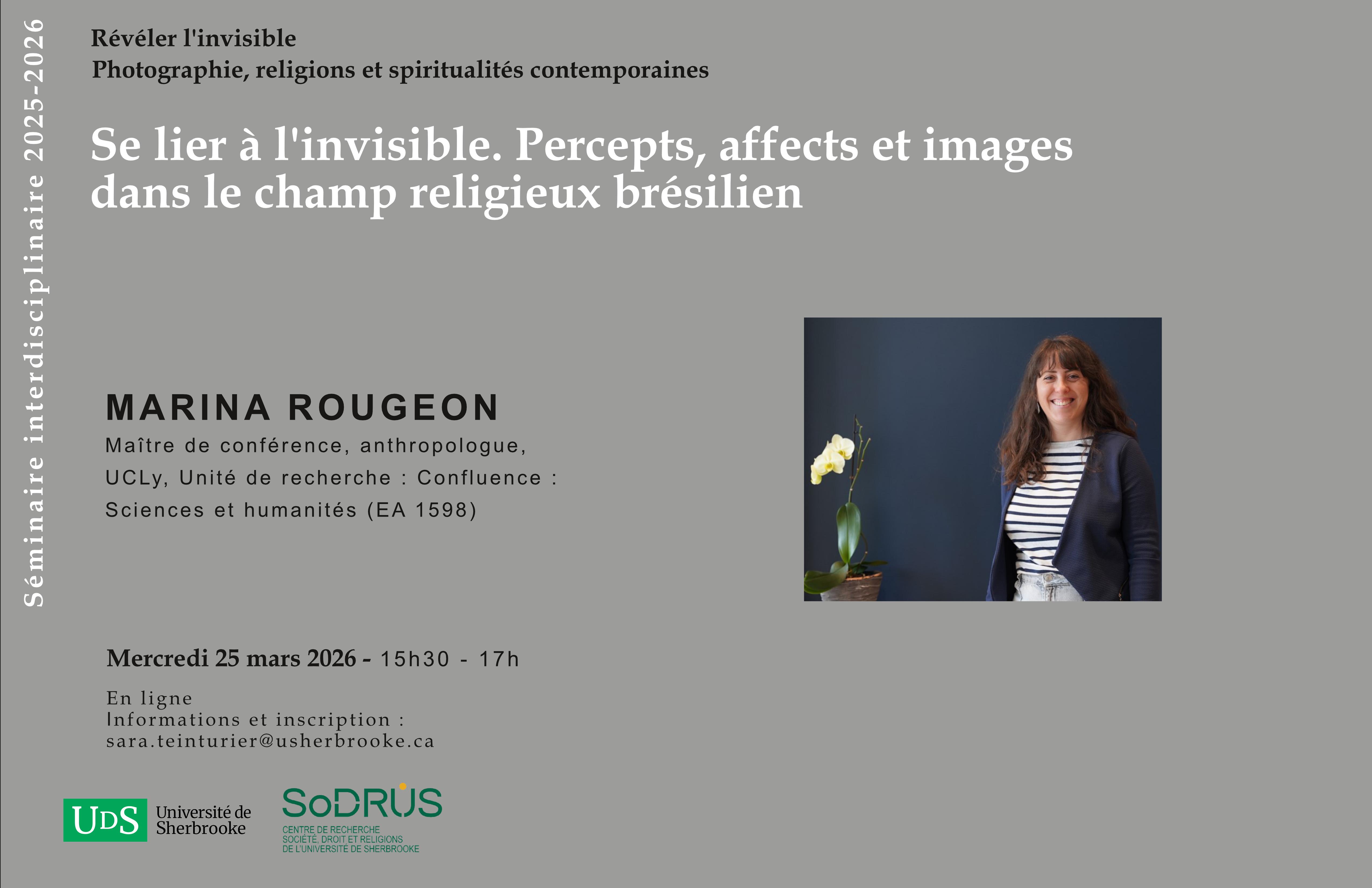 Docteure en anthropologie (Université Lumière Lyon 2), Marina Rougeon est maître de conférences de l’UCLy rattachée à l’Institut Société Famille, membre du groupe « Éducation, personne, accompagnement » de l’Unité de Recherche CONFLUENCE : Sciences et Humanités (EA 1598), et chercheure associée à l’UMR 5600 Environnement Ville Société. Elle mène des recherches à partir de terrains ethnographiques dans différentes régions du Brésil et en Europe méridionale, à la croisée de l’anthropologie visuelle, des religions et de la santé. Dans ses travaux, elle aborde entre autres questions théoriques et épistémologiques la proximité ; les discriminations (racisme) ; la guérison ; les rapports entre social, sens et affects ; les rapports aux formes de l’invisible (religions ; risques environnementaux) ; les écritures de l'anthropologie (film, photographie, dessins). Plus récemment, ses recherches s’ouvrent au champ de l’anthropologie de la famille et de la parenté, pour interroger en particulier les configurations contemporaines de la monoparentalité au Brésil. Marina Rougeon est également coordinatrice éditoriale à l'Unité de Recherche CONFLUENCE : Sciences et Humanités (EA 1598).
