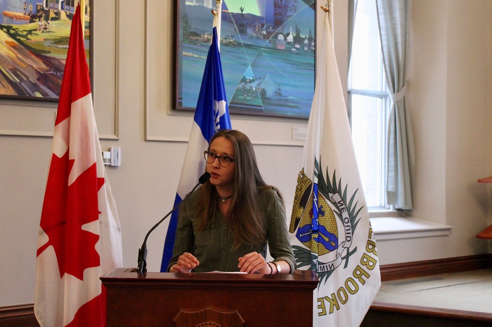Léa Loyez, étudiante française en génie civil, participante à un programme d’échanges avec l’Institut Supérieur Aquitain du Bâtiment et des Travaux Publics à Anglet en France, s’est également adressée à l’auditoire pour mettre en valeur la contribution réciproque des étudiantes et étudiants, de la Ville de Sherbrooke et de l’Université de Sherbrooke. « Les voyages nous aident à mieux nous connaître nous et devenir plus indépendants. Cela nous pousse à sortir de notre zone de confort, à aller à la rencontre de gens différents, de découvrir que d’autres saisons existent de l’autre côté du monde, de s’initier à de nouvelles cultures, un nouvel art de vivre comme le fait de mettre du fromage sur ses frites ou encore une nouvelle ostie de belle langue ».