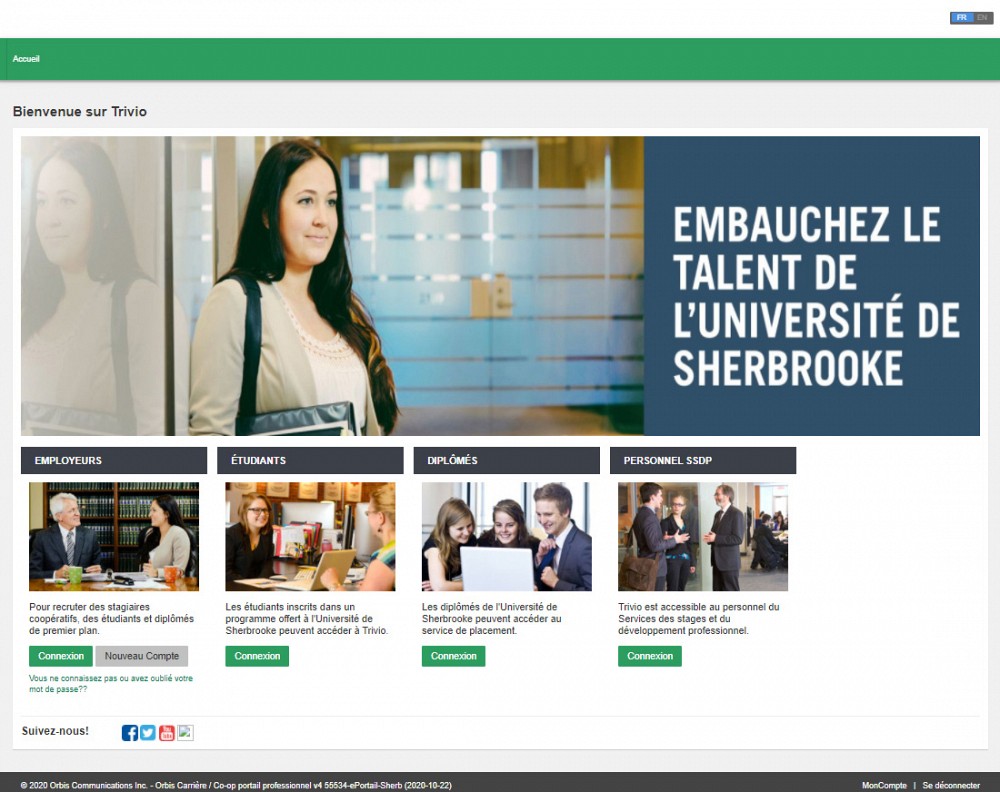 À noter que les recruteurs et recruteuses qui faisaient déjà affaire avec l’Université de Sherbrooke n’ont pas besoin de se créer de nouveau compte pour utiliser la section «Emplois et carrière». Lors de la première visite, il suffit simplement d’initialiser un mot de passe. De leur côté, les étudiantes et étudiants n'ont pas besoin de créer de compte. Pour avoir accès aux offres d'emploi, elles et ils n'ont qu'à se connecter à partir de la page d'accueil et d'utiliser le Service central d'authentification.