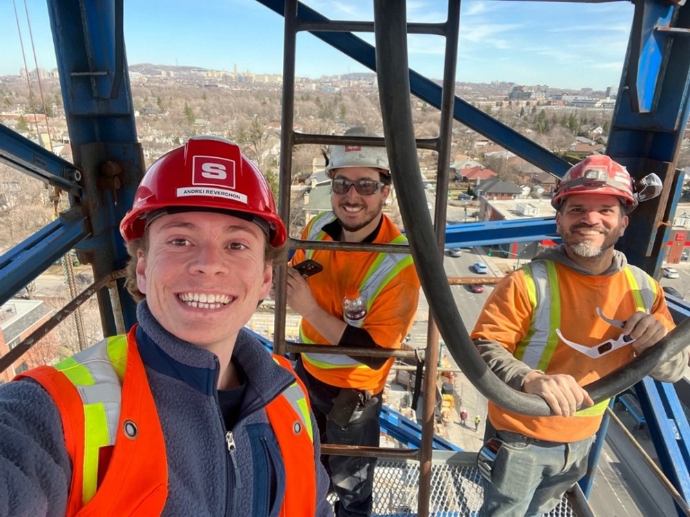 Andreï Reverchon, étudiant à la maîtrise en gestion de l’ingénierie à l’Université de Sherbrooke, sur le campus de Longueuil, en compagnie de deux collègues lors de son stage chez Coffrages Synergy