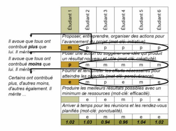 Pour chacun des critères, chaque membre de l’équipe a potentiellement 1 point. Dans l’exemple ci-dessus, chaque critère vaut 6 points. Les points sont distribués et un calcul effectué sur la fraction de points que mérite chacun des membres de l’équipe. Les valeurs attribuées à P (2), M (0) et E (1) mènent au calcul de différents facteurs de pondération. Un facteur de pondération final sera représentatif de la perception de tous les membres de l’équipe et est utilisé pour pondérer la note collective au travail d’équipe et déterminer la part que mérite chacun des étudiants.