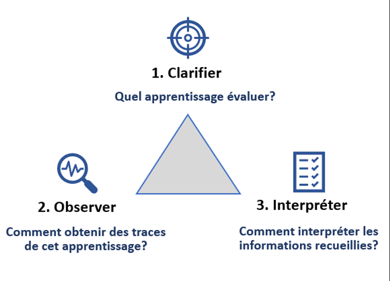De même, la démarche d'évaluation au service de l’apprentissage exige d'abord de (1) clarifier quel apprentissage évaluer pour connaitre précisément ce qui sera évalué. Cette clarification permettra plus aisément de déterminer le ou les moyen(s) pertinent(e) pour obtenir des traces de l’apprentissage visé. En effet, l'apprentissage étant un phénomène interne, pour (2) observer les apprentissages, il faut le faire de manière indirecte. Nous demandons à l'apprenant ou l’apprenante de réaliser une tâche ou une production dont la réalisation sous-tend certains acquis. Comme en recherche, les données obtenues (appelées ici « traces ») doivent être de qualité et en quantité suffisante pour permettre d’inférer l’intégration de certains apprentissages ou le développement d’une compétence. Enfin, (3) vient l'étape de l’interprétation du jugement. Le jugement doit permettre de faire ressortir le degré de développement de la compétence ou le niveau d’intégration des apprentissages. Comme en recherche, l’interprétation doit être bien instrumentée pour être le plus valide et le plus fiable possible.