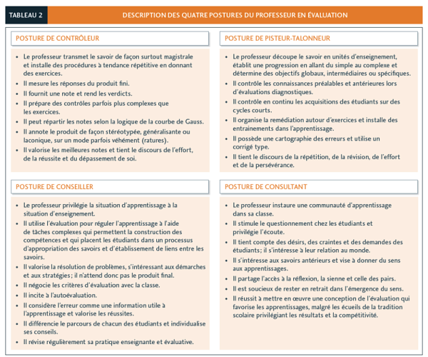 Chaumont et Leroux se sont attardées au biais de posture de la correctrice, du correcteur, ce biais ancré dans la perception de son rôle dans l’évaluation des apprentissages et elles ont pris appui sur les travaux de Jorro (2000) pour analyser la posture des quatre professeurs de leur étude. Anne Jorro propose de regrouper les gestes évaluatifs des professeurs selon quatre postures pouvant être adoptées, seules ou en combinaison, à différents moments de l’évaluation : le contrôleur, le pisteur-talonneur, le conseiller et le consultant. Chaque posture traduit la conception de l’apprentissage de l’enseignante, l’enseignant et colore la nature de ses interactions avec les étudiantes et étudiants dans l’alliance pédagogique. Le tableau suivant, une adaptation réalisée par Chaumont et Leroux, décrit les quatre postures de la professeure, du professeur en évaluation.