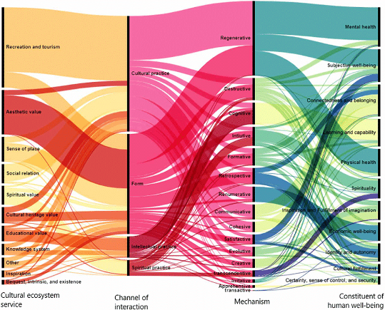 Huynh, L. et al. (2022) Linking the nonmaterial dimensions of human-nature relations and human weel-being through cultural ecosystem services. Université de Tokyo. Science Advances, https://www.researchgate.net/figure/Frequency-of-the-CESs-mechanisms-and-constituents-of-human-well-being-documented-in-the_fig2362514766