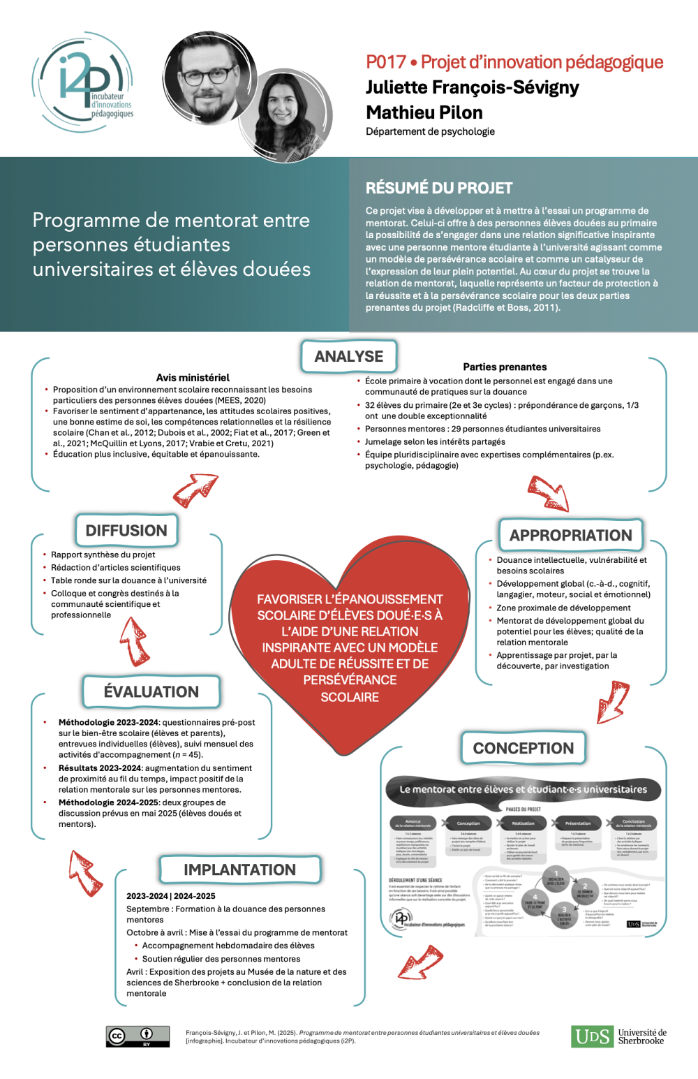 Nous les interrogeons sur l’avènement du projet et le besoin auquel il répond, sur ce qu’il permet aux personnes étudiantes de l’université de développer (en plus d’aider les élèves doués d’une école de Sherbrooke), sur les résultats obtenus grâce à la recherche qui accompagne cette innovation pédagogique et, bien sûr, sur l’apport de l’accompagnement offert par l’Incubateur d’innovations pédagogiques (i2P).