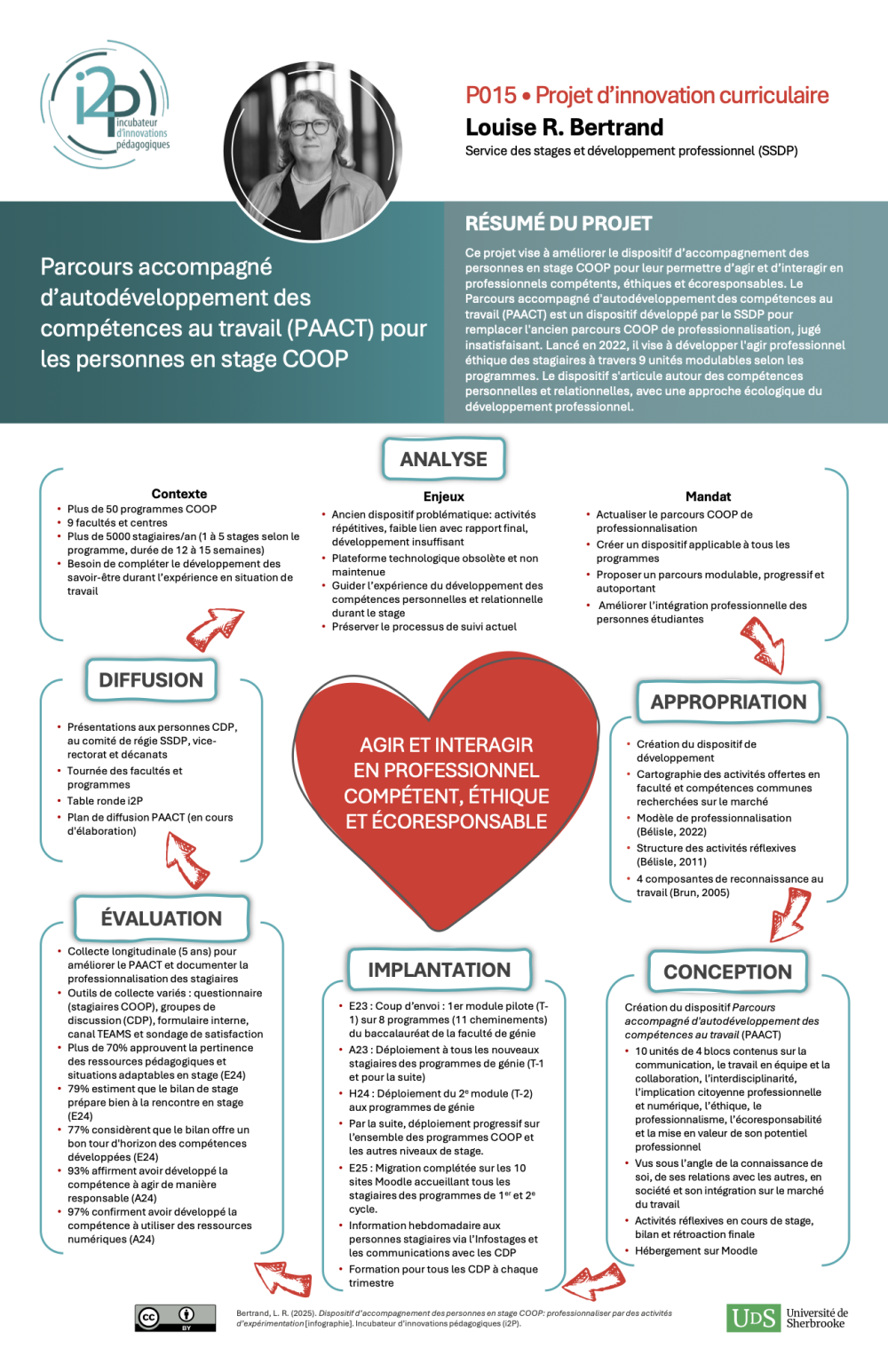 Mme Louise R. Bertrand, CRHA, est conseillère en développement professionnel au Service des stages et du développement professionnel (SSDP). À la suite de son parcours au Microprogramme de 3e cycle en pédagogie de l’enseignement supérieur avancé (MPUA), elle a été incubée à l’i2P pour le projet « Parcours accompagné d’autodéveloppement des compétences au travail (PAACT) pour les personnes en stage COOP ».