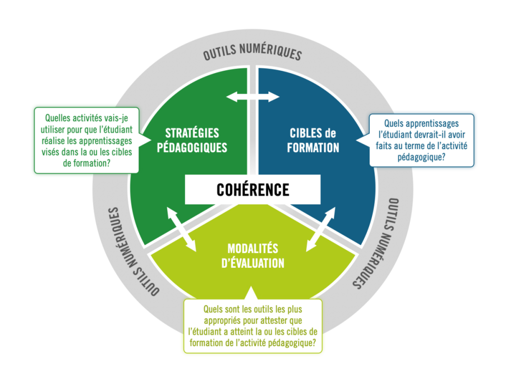 On schématise parfois cet alignement comme un triangle équilatéral entre les objectifs d’apprentissage, les modes d’évaluation et les activités pédagogiques. Bernatchez et Dulude (2010) proposent des questions associées aux trois pôles équilibrés de ce triangle :