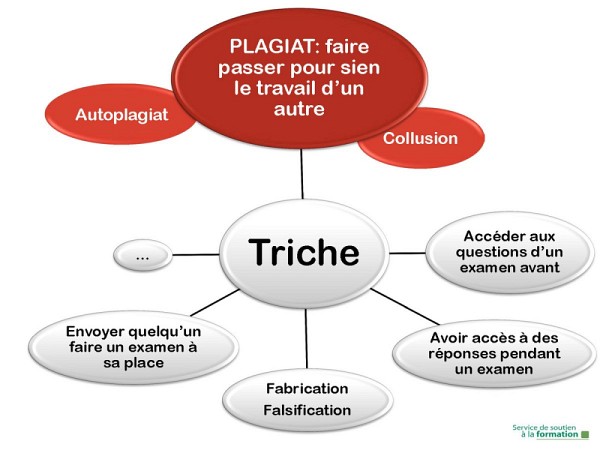 Le plagiat, qui consiste à faire passer pour sien le travail d’un autre, est une forme de triche s’il est fait dans l’intention de tromper. Le fait de soumettre un même travail pour des cours différents correspond à de l’autoplagiat, c’est-à-dire faire passer pour original un travail qui ne l’est pas et qui a déjà servi à obtenir des crédits.