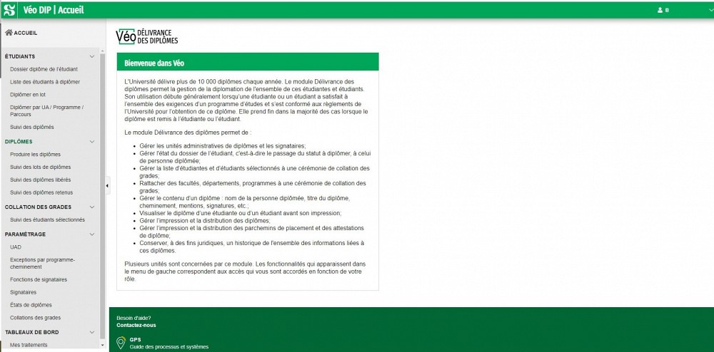 Dorénavant, il sera le logiciel utilisé par l'ensemble des membres du personnel de l'Université ayant un rôle à jouer dans la gestion de la diplomation. Les soumissions de diplomation, ainsi que la diplomation d'une personne se font désormais à l'aide de ce module et les fonctions équivalentes dans le SIIG ont été désactivées.