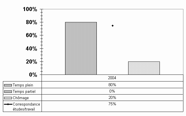 Étant donné le nombre restreint de répondants (5) au bac en sécurité et gestion de crise, aucune conclusion valable ne peut être tirée des données relatives à leur insertion professionnelle. Mentionnons tout de même qu'aucun d'entre eux n'avait eu un travail régulier avant d'entreprendre ses études au bac, que quatre répondants sur cinq décrochent un emploi à temps plein avant la fin de leurs études (l'autre répondant a toutefois dû attendre un peu plus d'un an), que tous ceux qui travaillent le font à temps plein, que ce sont des postes permanents, que trois fois sur quatre il y a correspondance études-travail et que deux répondants gagnaient entre 31 000 $ et 33 000 $ par année alors que les deux autres touchaient un revenu annuel supérieur à 35 000 $. Il peut être intéressant aussi de souligner que trois répondants sur quatre poursuivent des études tout en travaillant à temps plein. Tous les trois sont à la maîtrise : deux d'entre eux étudient en administration publique et le dernier en environnement. |