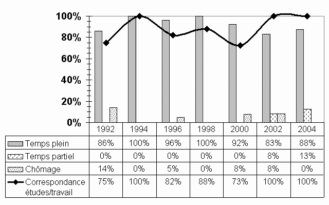 La première année qui suit l'obtention du baccalauréat en chimie, une majorité de répondants (60,0 %) décident de poursuivre des études et la plupart du temps, ils optent pour une spécialisation de deuxième cycle en chimie. L'accès au marché du travail semble passer presque inévitablement par des études à la maîtrise. D'ailleurs, ils invoquent tous les exigences de la profession comme motif principal. Pour ceux qui ont opté pour le marché du travail, la première année semble avoir été assez difficile puisque deux répondants sur quatre sont en chômage. Cette situation se modifie toutefois du tout au tout en 2004 : il n'y a plus de chômage, 87,5 % des emplois sont à temps plein et ils correspondent tous à la formation reçue. Par contre, depuis la Relance 1998, les emplois précaires et contractuels sont de plus en plus nombreux (12,5 % en 1998, 18,2 % en 2000, 27,3 % en 2002 et 37,5 % en 2004) et les salaires sont à la baisse depuis la dernière relance (en 2002, 60,0 % des répondants gagnaient plus de 37 000 $ par année ; aujourd'hui ce pourcentage n'est plus que de 28,6 %). Notons aussi certaines caractéristiques qui distinguent ces répondants de ceux de l'ensemble du premier cycle : - ils sont généralement plus jeunes (ils avaient tous moins de 27 ans vs 75,7 %) ; - ils ont tous accédé aux études universitaires à partir d'un D.E.C. général vs 72,7 % ; - trois répondants sur quatre ont pris connaissance de leur premier emploi via Internet vs 11,3 %. |