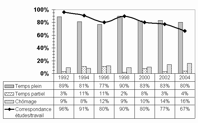 Pour satisfaire aux exigences de la pratique du droit et être admis au Barreau ou à la Chambre des notaires, ces diplômés doivent poursuivre leur formation pendant environ un an. Afin de respecter des délais similaires à l'ensemble des autres programmes universitaires, c'est-à-dire un an et deux ans après la fin des études, ce sont donc des diplômés de 2001 qui ont été interrogés. Malgré tout, plusieurs répondants sont toujours aux études deux ans (38,7 %) et trois ans (15,6 %) après l'obtention de leur diplôme, et les motifs qu'ils invoquent sont principalement les exigences de la profession, l'incapacité de trouver un travail satisfaisant ou le désir d'augmenter leurs possibilités d'emploi. En ce qui concerne l'accès au marché du travail, des écarts relativement importants entre les répondants apparaissent : - les délais avant de trouver un premier travail à temps plein sont dans certains cas relativement courts (56,3 % des répondants l'obtiennent dans les trois mois qui suivent la fin de leurs études) alors que dans d'autres ils sont particulièrement longs (25,0 % d'entre eux ont eu besoin de plus d'un an) ; - les revenus annuels peuvent être assez élevés (25,0 % des répondants gagnaient plus de 45 000 $ par année) mais aussi très bas (ils étaient 20,0 % à gagner moins de 23 000 $). Globalement, lorsqu'on compare ces répondants à l'ensemble des répondants du premier cycle, on constate une insertion professionnelle plus difficile : - bien que 80,0 % des répondants en recherche d'emploi réussissent à décrocher un travail à temps plein, seulement 66,7 % de ces emplois correspondent à la formation reçue vs 91,4 % ; - le taux de chômage est particulièrement élevé (16,0 % vs 3,3 %) ; - leurs revenus annuels sont généralement plus faibles (40,0 % gagnaient moins de 31 000 $ vs 18,3 %) ; - le nombre d'heures travaillées par semaine est plus fréquemment élevé (30,0 % travaillent plus de 46 heures par semaine vs 14,4 %). |