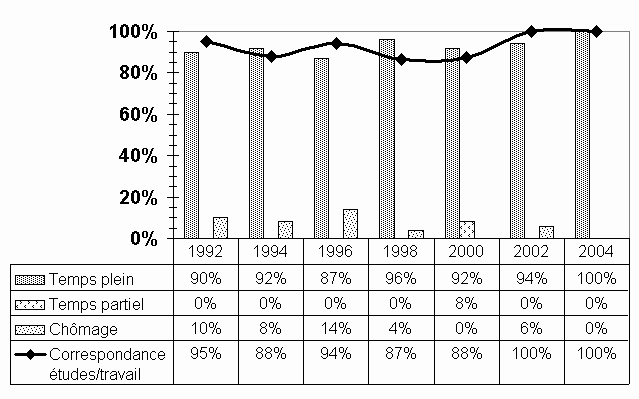 Compte tenu du nombre restreint de répondants du baccalauréat en génie civil (6), l'interprétation des données relatives à leur insertion professionnelle devrait être faite avec réserve. Mentionnons tout de même qu'ils ont tous décroché un travail à temps plein dans les trois mois qui ont suivi la fin de leurs études, que ce sont des emplois permanents qui correspondent à leur domaine de formation et qu'ils gagnent plus de 41 000 $ par année dans 83,3 % des cas. Soulignons également que, contrairement à l'ensemble des répondants du premier cycle, les hommes sont majoritaires (100,0 % vs 44,2 %) et que le pourcentage de répondants ayant été admis au baccalauréat avec une formation technique de niveau collégial est plus élevé (40,0 % vs 13,6 %). Quatre répondants sur six ont pris connaissance de leur premier emploi à la suite d'un stage vs 33,1 %. |