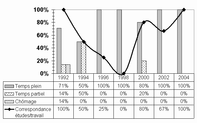 Compte tenu du très petit nombre de répondants (3), les données statistiques doivent être considérées avec réserve. Mentionnons tout de même que, comme par le passé, la très grande majorité des diplômés du bac en physique poursuivent des études de deuxième cycle (3/3 après un an et 1/2 après deux ans). L'intérêt personnel et le désir d'augmenter ses compétences sont les principaux motifs invoqués. Une personne s'est inscrite à la maîtrise en physique, une autre à la maîtrise en génie électrique et la dernière étudie à la maîtrise en radiobiologie (médecine nucléaire). Celui qui travaille exerce un emploi à temps plein qui correspond à la formation qu'il a reçue et ses revenus se situent entre 39 000 $ et 41 000 $ par année. Par contre, il occupe un poste contractuel temporaire et le fait qu'il l'ait obtenu après deux ans et que la première année tous les répondants étudiaient laisse à penser que cet emploi est plutôt le fruit des études supérieures entreprises que du baccalauréat. Par ailleurs, si on se reporte aux données recueillies lors des enquêtes précédentes, on peut présumer qu'une formation de premier cycle en physique est insuffisante pour accéder au marché du travail, ou encore, que ce n'est pas l'objectif premier de ceux qui entreprennent ces études. |