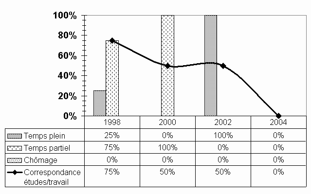 Compte tenu du très petit nombre de répondants (2), ces données doivent être considérées avec réserve. Mentionnons tout de même que, comme par le passé, les diplômés des baccalauréats en musique sont peu nombreux et qu'ils poursuivent presque toujours leurs études plutôt que d'aborder le marché du travail. D'ailleurs, deux ans après l'obtention de leur baccalauréat, les deux diplômés qui ont répondu à l'enquête sont toujours aux études. L'un d'eux s'est inscrit à la maîtrise en musique (interprétation) et l'autre fait un deuxième bac en éducation musicale. Les motifs qu'ils invoquent sont les exigences de la profession et le désir d'augmenter leurs compétences. |
