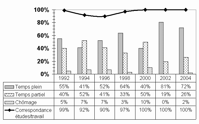 Tout comme c'était le cas lors des relances antérieures, l'entrée sur le marché du travail des répondants du bac en enseignement au préscolaire et au primaire se fait par l'intermédiaire d'emplois contractuels (96,4 % des postes occupés sont temporaires). Par contre, toutes les autres statistiques relatives à l'emploi sont plutôt favorables : ces répondants travaillent presque tous (98,2 %), les emplois correspondent toujours à la formation reçue et sont en majorité des emplois à temps plein (71,9 % - ce pourcentage est légèrement inférieur à celui de l'enquête précédente (80,6 %) mais est tout de même beaucoup plus élevé comparativement aux relances passées (voir tableau)) et dans 71,4 % des cas, ces emplois sont obtenus dans les trois mois qui suivent la fin des études. Notons également que les diplômés sont presque exclusivement des femmes (96,8 %) et qu'ils prennent connaissance de leur premier emploi principalement lors d'un stage (dans 41,5 % des cas) ou de visites, lettres et téléphones aux employeurs (31,7 %). |