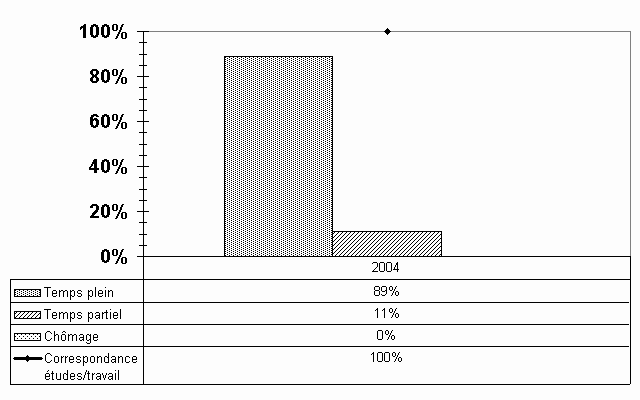 Les répondants du bac en kinésiologie de la Relance 2004 sont les premiers à être interrogés. Ce programme a été créé en 1998. Auparavant, c'est le baccalauréat en activité physique avec cheminement en milieu extra-scolaire qui s'approchait le plus de la formation actuelle. Si on désire comparer l'insertion professionnelle des répondants actuels à ce qui prévalait lors des enquêtes précédentes, il est toujours possible de consulter les relances antérieures sous la rubrique "activité physique". Toutefois, ces données ne sont que partiellement comparables puisque à l'époque, ce programme regroupait le cheminement extra-scolaire et le cheminement scolaire. Ce dernier correspond aujourd'hui au programme d'enseignement en éducation physique et à la santé. Mentionnons néanmoins que l'accès au travail des répondants en kinésiologie ne semble pas présenter de difficultés majeures. Malgré le fait que 42,9 % des répondants doivent attendre plus de trois mois avant d'obtenir un premier emploi à temps plein, on constate qu'en 2004, il n'y a pas de chômage, que tous les emplois correspondent à la formation reçue et que neuf fois sur dix (88,9 %), ce sont des emplois à temps plein. De plus, la personne qui occupe un poste à temps partiel dit l'avoir fait par choix. Par contre, les emplois précaires demeurent fréquents, surtout par comparaison avec l'ensemble des répondants du premier cycle (66,7 % vs 35,7 %). Soulignons également que ces répondants sont en majorité des femmes (70,0 %). |