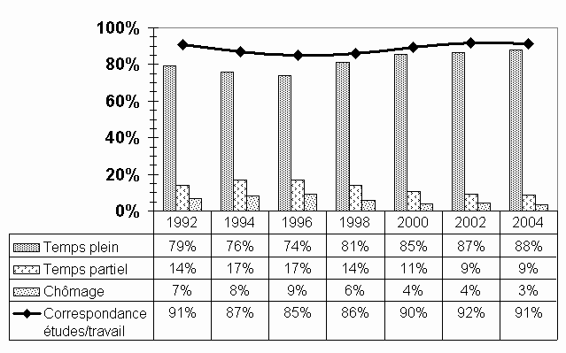 Par comparaison avec les relances antérieures, l'accès au marché du travail reste très favorable. Si les relances des années 1990 à 1996 présentaient une situation d'insertion professionnelle qui graduellement se dégradait, depuis l'enquête de 1998, cette tendance s'est inversée et on constate une reprise qui se poursuit et même, sur certains points, qui s'accentue avec la Relance de 2004 (voir tableau). On observe, entre autres, que le taux de chômage n'a jamais été aussi bas (3,3 % vs 3,8 % en 2000) et les emplois à temps plein aussi nombreux (88,1 % vs 86,6 % en 2002). De plus, la correspondance études-travail égale celle de 2002, qui représentait le pourcentage le plus élevé (91,4 % vs 91,8 % en 2002). Toutefois, les délais avant de décrocher un premier emploi à temps plein sont en général un peu plus long (plus de trois mois : 30,8 % vs 23,9 % en 2002) et les emplois précaires, c'est-à-dire contractuels et temporaires, recommencent à augmenter (de 38,5 % en 1994, ils étaient passés à 30,7 % en 2002 ; ils sont maintenant remontés à 35,7%). Soulignons également une autre particularité qui distingue ces répondants de ceux de 2002 : leurs revenus annuels moyens ont augmenté (32,6 % d'entre eux gagnent entre 37 000 $ et 45 000 $ par année vs 23,8 % en 2002). Par contre, ceux qui gagnent des salaires très élevés sont moins nombreux (plus de 51 000 $ : 11,0 % vs 16,2 % en 2002). On observe aussi qu'Internet devient un outil de plus en plus utilisé pour prendre connaissance de son premier emploi (2,2 % des répondants en 2000 ; 6,9 % en 2002 ; 11,3 % en 2004). |