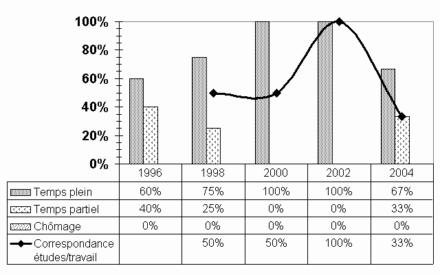 Compte tenu du nombre restreint de répondants aux maîtrises en droit et politiques de la santé, aucune conclusion valable ne peut être tirée de ces statistiques, d'autant plus que quatre répondants sur cinq disent avoir gardé ou réintégré leur ancien emploi. On ne peut donc pas parler d'une situation d'insertion professionnelle après les études. En fait, pour plusieurs d'entre eux, cette maîtrise semble avoir surtout servi à acquérir une formation permettant de mieux exercer leurs activités professionnelles. Mentionnons tout de même que deux répondants sur trois exercent une profession qui n'a pas de rapport direct avec leurs études de deuxième cycle et qu'un emploi sur trois est de type contractuel. Notons également que par rapport à l'ensemble des répondants du deuxième cycle, ces diplômés sont en général plus âgés (71,4 % d'entre eux ont plus de 40 ans vs 17,3 %) et que dans 88,3 % des cas, ils étaient sur le marché du travail avant d'entreprendre leurs études de maîtrise vs 46,6 %. |