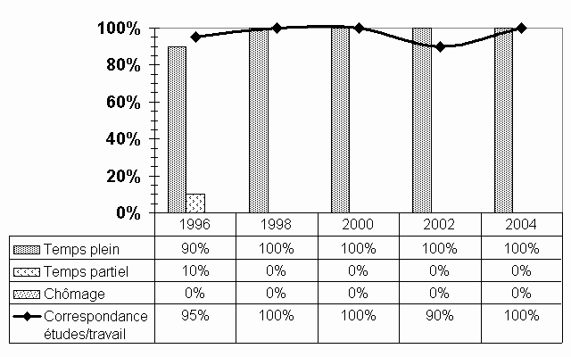 L'accès au marché du travail pour les répondants des maîtrises en fiscalité ne présente aucune difficulté, tout comme c'était le cas lors des relances précédentes. Qu'ils aient conservé ou réintégré leur ancien emploi, ou qu'ils aient eu à en trouver un nouveau (ce qui était le cas de 40 % d'entre eux), ils ont tous un travail à temps plein, permanent et correspondant à leur formation. D'ailleurs, toutes les données relatives à leur insertion professionnelle sont supérieures à celles de l'ensemble des répondants du deuxième cycle : - il n'y a pas de chômage vs 4,9 % ; - tous ont un emploi à temps plein vs 87,8 % ; - tous travaillent dans leur domaine d'études vs 87,8 % ; - tous les postes sont permanents vs 80,3 % ; - tous ceux qui désirent un travail à temps plein l'obtiennent avant même la fin de leurs études vs 52,7 % ; - leurs revenus annuels sont plus élevés (85,7 % gagnent plus de 55 000 $ vs 49,3 %) ; - en revanche, la moyenne d'heures de travail par semaine est, elle aussi, plus élevée (53,4 % des répondants travaillent plus de 46 heures par semaine vs 31,2 %). Mentionnons également que ces diplômés se distinguent de l'ensemble des répondants du deuxième cycle par le fait que : - la moitié d'entre eux avaient travaillé dans un domaine similaire à leurs études de maîtrise avant d'entreprendre celles-ci vs 29,2 % ; - ils sont plus âgés (80 % d'entre eux ont plus de 30 ans vs 50,8 %) ; - dans 21,4 % des cas, ils avaient déjà un diplôme d'études supérieures (maîtrise ou doctorat) avant de s'engager dans cette maîtrise. |