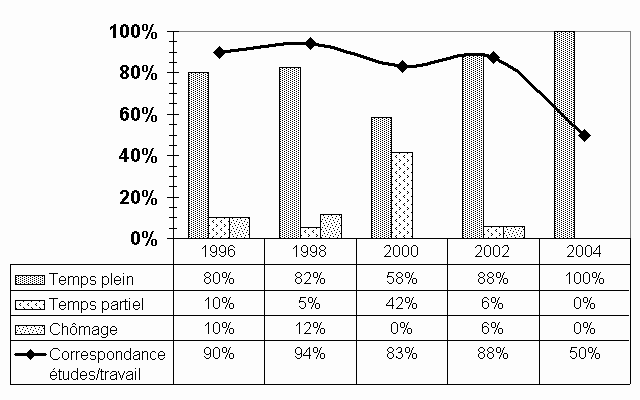 Compte tenu du très petit nombre de répondants aux maîtrises en sciences de l'éducation, aucune conclusion valable ne peut être tirée de ces statistiques, d'autant plus qu'un répondant sur deux dit avoir réintégré son ancien emploi. On ne peut donc pas véritablement parler d'insertion professionnelle. Soulignons malgré tout que ces répondants poursuivent tous des études, que ce soit par intérêt ou par nécessité professionnelle. Une personne poursuit un diplôme d'études supérieures en génie informatique et les deux autres font des microprogrammes de deuxième cycle : l'un d'eux en éthique appliquée et l'autre en administration scolaire. |