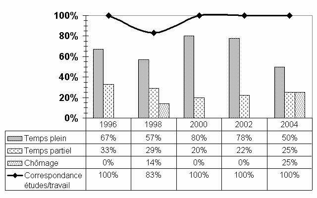 Compte tenu du très petit nombre de répondants (4) aux maîtrises en service social, aucune conclusion valide ne peut être tirée des données obtenues. Mentionnons tout de même qu'avant d'entreprendre leurs études de maîtrise, aucun des répondants n'avait eu de travail régulier, que trois répondants sur quatre sont en emploi, dont deux à temps plein, que ces emplois ont été obtenus dans les trois mois qui ont suivi la fin de leurs études, qu'ils correspondent tous à la formation reçue, que ce sont tous des postes permanents (ce qui est plutôt inhabituel compte tenu du fait que lors des relances antérieures, les pourcentages d'emplois contractuels et précaires étaient particulièrement élevés) et que les écarts salariaux sont importants (une personne gagne entre 45 000 $ et 47 000 $ par année alors que l'autre a un revenu annuel de moins de 27 000 $). |