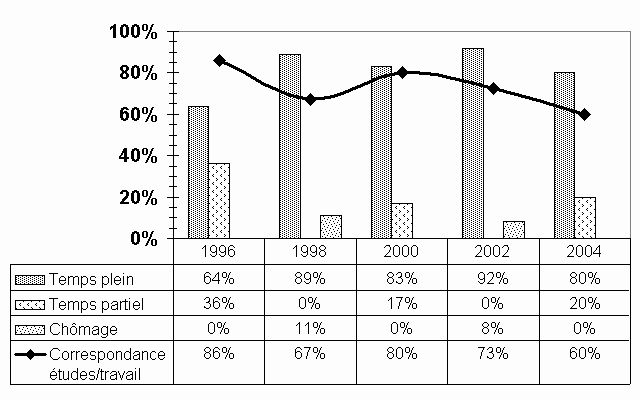 Comme c'était le cas lors des dernières relances, plusieurs répondants décident de poursuivre des études après leur maîtrise. Deux ans après l'obtention de celle-ci, 58,3 % d'entre eux étudient toujours et trois fois sur quatre, ils font des études de doctorat. Ils invoquent comme raison principale les exigences de la profession, mais aussi l'intérêt pour les études et la possibilité d'augmenter leurs compétences. Quant à ceux qui choisissent d'accéder au marché du travail, ils sont tous en emploi, ces emplois sont obtenus avant même la fin de leurs études et quatre fois sur cinq, ce sont des postes permanents. Par contre, il n'y a que 60 % de ces emplois qui correspondent à la formation reçue et leurs revenus annuels sont légèrement inférieurs à ceux que l'on rencontre habituellement au deuxième cycle (deux répondants sur quatre gagnent moins de 41 000 $ vs 26,3 % pour l'ensemble du deuxième cycle). Mentionnons également que ces diplômés sont en général plus jeunes (83,3 % des répondants ont moins de 30 ans vs 49,3 % pour l'ensemble du deuxième cycle) et que dans 90 % des cas, ils n'ont jamais occupé d'emploi régulier avant leur maîtrise. Il est également important de souligner que les données relatives à l'insertion professionnelle de ces répondants doivent être considérées avec une certaine réserve, étant donné le nombre restreint de diplômés au travail (5). |