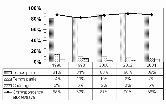 De prime abord, les statistiques relatives à l'emploi des répondants du deuxième cycle sont bonnes et assez similaires à celles que l'on rencontre au premier cycle. Les différences sont presque toujours minimes. On constate, notamment, un taux de chômage un peu plus élevé (4,9 % vs 3,3 %), des emplois à temps plein légèrement moins nombreux (87,8 % vs 88,1 %) et un pourcentage de correspondance études-travail un peu moins important (87,8 % vs 91,4 %). En revanche, les délais avant d'obtenir un premier emploi à temps plein sont généralement plus courts (moins de trois mois : 72,9 % vs 69,2 %), les postes permanents sont plus fréquents (80,3 % vs 64,3 %) et les revenus annuels sont dans la plupart des cas plus élevés (49,3 % des répondants gagnent plus de 55 000 $, alors qu'au premier cycle, ils ne sont que 11,0 % à gagner plus de 51 000 $). Soulignons d'une part que ces répondants sont habituellement plus âgés (un répondant sur deux a plus de 30 ans vs 10,4 %) et qu'ils ont déjà été sur le marché du travail (ce qui peut, en bonne partie, expliquer les différences de salaires et d'emplois permanents). D'ailleurs, 46,6 % d'entre eux avaient eu un emploi régulier avant d'entreprendre leurs études vs 17,2 % et ils mentionnent avoir conservé ou réintégré leur ancien emploi dans 41,4 % des cas vs 9,3 % au premier cycle. Mentionnons également qu'ils sont plus nombreux à travailler plus de 46 heures par semaine : 31,2 % vs 14,4 %. D'autre part, si on compare l'insertion professionnelle de ces répondants à ce qui prévalait lors de la Relance 2002, on remarque que, malgré une situation qui demeure intéressante, presque toutes les variables sont légèrement à la baisse : - les emplois à temps plein sont moins nombreux (87,8 % vs 89,7 %) ; par contre, c'est plus souvent par choix qu'ils travaillent à temps partiel (50,0 % vs 40,7 %) ; - il y a plus de chômage (4,9 % vs 2,8 %) ; - la correspondance études-travail est un peu moins élevée (87,8 % vs 89,6 %) ; - les délais avant d'obtenir un premier emploi à temps plein sont un peu plus longs (moins de trois mois : 72,9 % vs 82,4 % en 2002) ; - par contre, le pourcentage d'emplois permanents demeure presque identique (80,3 % vs 80,9 % en 2002) et les revenus annuels sont en général plus élevés (plus de 55 000 $ : 49,3 % vs 40,1 % en 2002). |