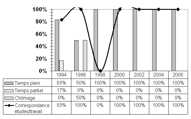 Étant donné le nombre restreint de répondants, ces données doivent être considérées avec réserve. Mentionnons, malgré tout, que la très grande majorité des répondants du bac en biochimie poursuivent des études après l'obtention de leur diplôme (8/9) et, la plupart du temps, dans le même domaine ou dans une spécialité connexe. Six d'entre eux continuent à la maîtrise (deux en biochimie, un en biologie cellulaire, un en microbiologie, un en sciences biomédicales et un en biologie) et un autre a fait un diplôme d'études supérieures en enseignement au collégial. L'accès au marché du travail semble passer presque inévitablement par des études supérieures. D'ailleurs, les motifs invoqués sont principalement l'augmentation des possibilités d'emploi, les exigences de la profession et le fait de ne pas avoir trouvé d'emploi satisfaisant. Quant à celui qui s'est dirigé vers le marché du travail, il occupe un emploi à temps plein, contractuel non renouvelable et connexe à son domaine d'études. Soulignons également qu'ils avaient tous accédé à leurs études de 1er cycle à partir d'un DEC préuniversitaire et qu'aucun d'eux n'avait eu d'emploi régulier, autre qu'un emploi étudiant, avant d'entreprendre ces études. |
