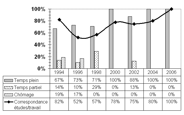 Lors des relances précédentes, une majorité de répondants poursuivaient des études de maîtrise après l'obtention de leur baccalauréat. Par contre, après deux ans, la plupart d'entre eux avaient délaissé les études pour le marché du travail. En 2006, la situation prend une tournure passablement différente. Un an après leur diplôme de 1er cycle, on observe un pourcentage de répondants aux études encore plus élevé que lors des relances précédentes (92,9 % alors que ce pourcentage n'avait jamais dépassé 62,5 %) et, après deux ans, il y a toujours 71,4 % des répondants aux études. Malgré tout, ceux qui ont fait le choix d'accéder au marché du travail ne semblent pas avoir éprouvé de difficultés particulières. On constate qu'ils travaillent tous à temps plein, que ces emplois correspondent à la formation reçue et que trois fois sur quatre ce sont des postes permanents. Évidemment, vu le nombre restreint de répondants en emploi (un en 2005 et quatre en 2006), toutes ces données statistiques doivent être considérées avec circonspection. Mentionnons, aussi, qu'à l'inverse des diplômés du 1er cycle, les hommes sont majoritaires (71 % vs 44 %). |