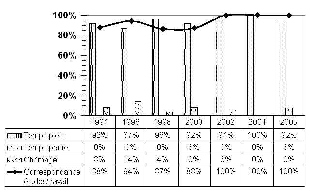 L'entrée sur le marché du travail des répondants du bac en génie civil donne l'impression d'être particulièrement aisée. Deux ans après la fin de leurs études, tous ceux qui souhaitaient travailler sont en emploi; il y a correspondance études-travail dans tous les cas; 92,3 % des répondants décrochent un emploi à temps plein, et ce, dans des délais généralement très courts (91 % d'entre eux y parviennent à l'intérieur des trois mois suivant la fin des études); un peu plus de neuf fois sur dix (92,3 %), ce sont des postes permanents et la moitié d'entre eux reçoit un salaire annuel supérieur à 45 000 $. Notons également que par rapport à l'ensemble des répondants du 1er cycle : - on retrouve une majorité d'hommes (86 % vs 44 %); - ils sont généralement plus âgés (57,1 % d'entre eux avaient plus de 27 ans vs 25,6 %); - et une fois sur deux, c'est à la suite d'un stage qu'ils décrochent un premier emploi à temps plein vs 32 %. |
